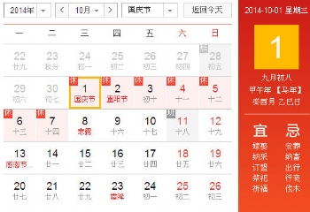 根據(jù)《國(guó)務(wù)院辦公廳關(guān)于2014年部分節(jié)假日安排的通知》精神,2014國(guó)慶節(jié)放假安排為:10月1日(星期三)至10月7日(星期二)放假調(diào)休,共7天。