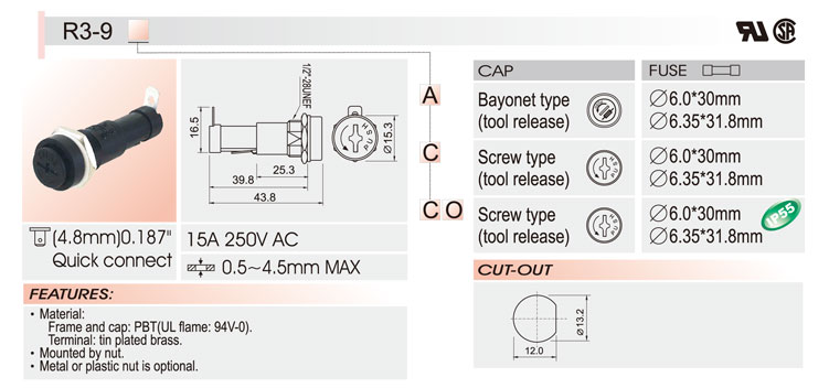 6*30面板安裝保險(xiǎn)絲座 R3-9 UL CSA 15A250V