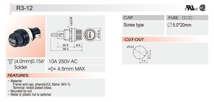5*20 面板安裝保險(xiǎn)絲座 R3-12 UL CSA 10A250V