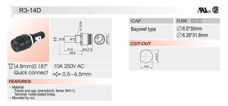 6*30面板安裝保險(xiǎn)絲座 R3-14D UL CSA 10A250V