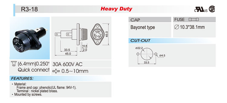 10*38面板安裝保險絲座 R3-18 UL CSA 30A600V