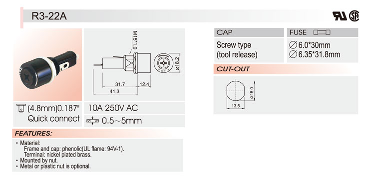 6*30面板安裝保險絲座 R3-22A UL CSA 10A250V