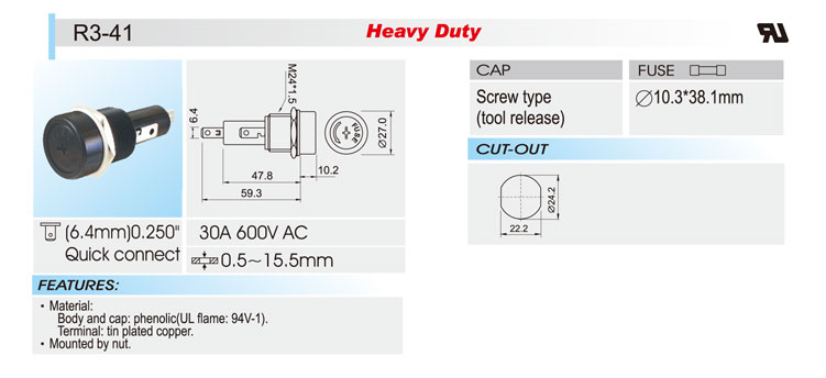 10*38面板安裝保險(xiǎn)絲座 R3-41 UL CSA 30A600V