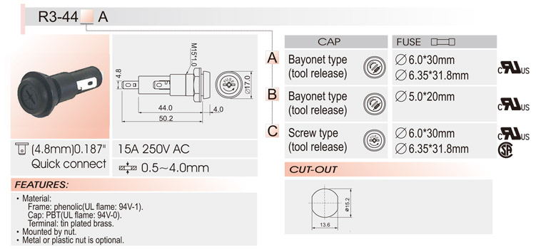 5*20/6*30 面板安裝保險絲座 R3-44 UL CSA 15A250V