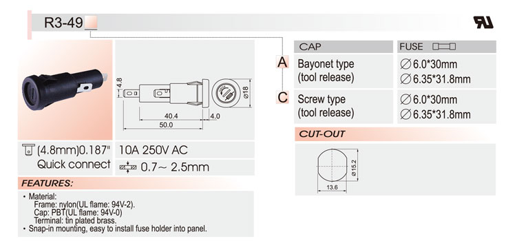 6*30面板安裝保險(xiǎn)絲座 R3-49 UL CSA 10A250V