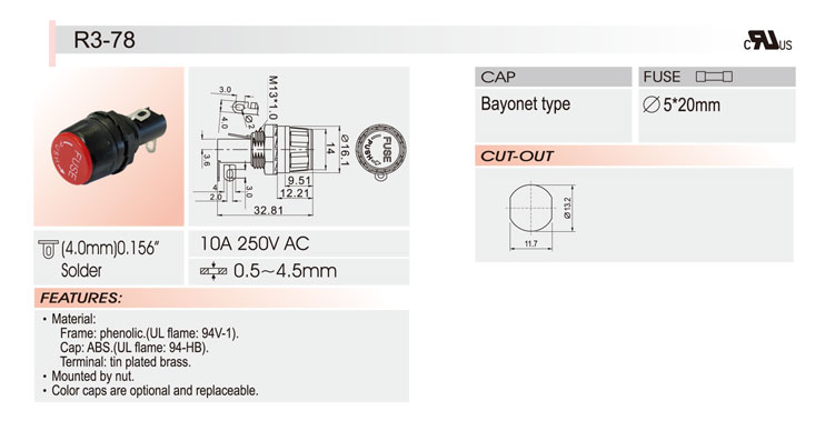 5*20面板安裝保險(xiǎn)絲座 R3-78 UL CSA 10A250V
