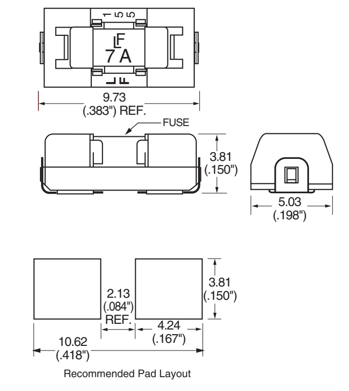 座子原材料(Base of raw materials)。 材料(Material science):EI130+磷銅(EI130 + phosphor copper)。阻燃度94 V0。 接觸件(Contact):磷銅鍍霧錫(Tin phosphor copper plating fog)。 適配貼片保險絲(Adapter patch fuses): 6.1*2.7mm. 適用于電路保護(hù)(Suitable for circuit protection)。 耐高溫波風(fēng)焊260度:(Resistance to high temperature wave solderi ng wind 260 degrees)。 裝配方式(Assembly):波風(fēng)爐、焊接(The wind furnace, welding)。 安規(guī)認(rèn)證(Safety certification)保險絲有UL認(rèn)證。 (The fuse has UL certification)。