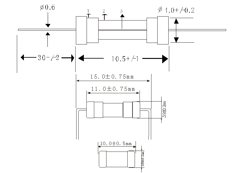 例子[example]: 3GFU 1A 250V 1)系列號 Part Number 2)額定電流 Rated Current 1) 2) 3) 3)額定電壓 Rated Voltage 1-2 額定電流和額定電壓 Rated Current And Voltage 額定電流: 100mA~10A Rated Current: 100mA~10A 額定電壓;125V/250V AC Rated Voltage:125V/250V AC 1-3標(biāo)示Marking 保險絲上需有下列標(biāo)示 The fuse shall have the following marking: 規(guī)格:特性符號+額定電流+額定電壓 Specification:Characteristic Symbol+Rated Voltage 100mA~800mA : _mA250V 1A~10A:_A250V Trade mark:The Manufacture’s Logo+Part Number+Approvals 100mA~10A: ![]() 注意:對標(biāo)示字樣大小沒有規(guī)定 Note:Size of the markings have not be specified. 2.適用範(fàn)圍 SCOPE 適用於一般電子設(shè)備。Used in electronic equipment. 3.工程圖和結(jié)構(gòu) OUTLINE DRAWING AND STRUCTURE 3-1 工程圖(單位:mm) Outline Drawing and Dimensions(Unit:mm)