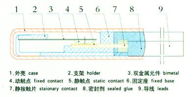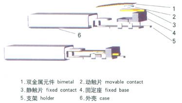 BR/TH-A1D series thermal protector is composed by heat conductive metal shell, bimetal component welded silver alloy contact, current conductive frame, insulated fixing seat, static contact pad and heat resistant wires etc. When the current goes through the bimetal component with impedance, if the current increases or the environment temperature rises and the temperature reaches the preset value, the bimetal component will work and release the contact to shut off the circuit; and by contrast, if the device cools down to the safe temperature, the contact point will reset automatically.